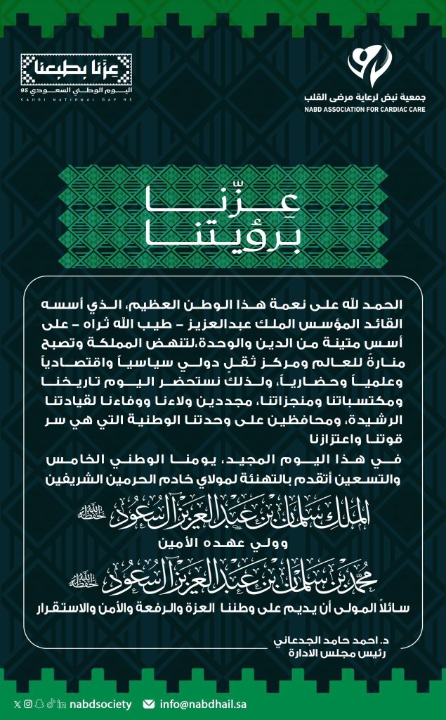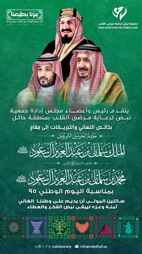 #تهنئة | يتقدم رئيس وأعضاء مجلس إدارة جمعية نبض لرعاية مرضى القلب بمنطقة حائل بالتهنئة لمقام خادم الحرمين الشريفين وسمو ولي عهده الأمين – حفظهما الله – والشعب السعودي بمناسبة #اليوم_الوطني_السعودي_95