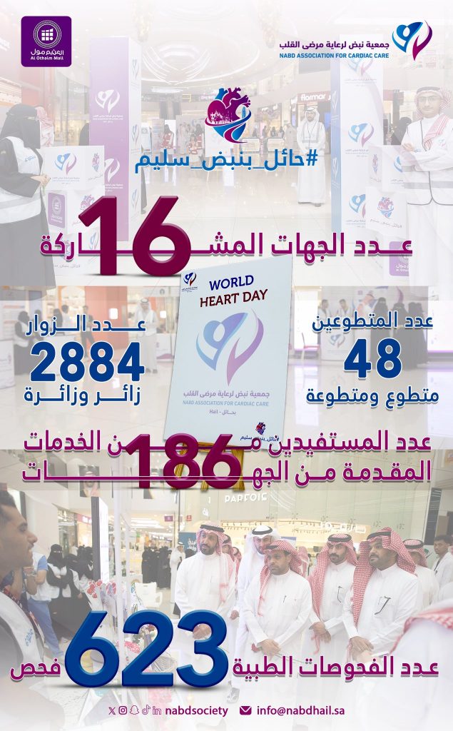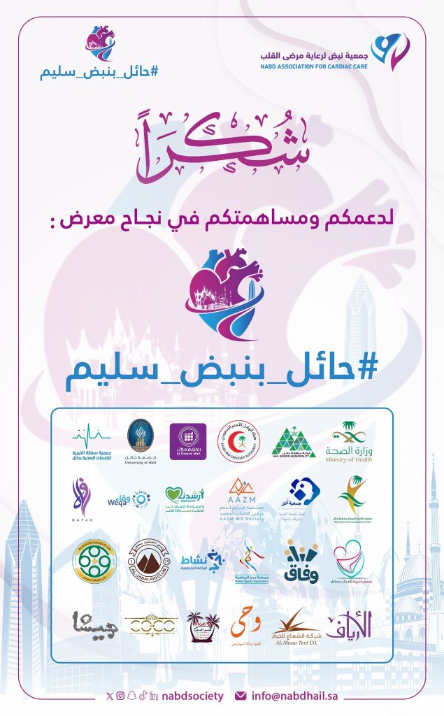 تتقدم جمعية نبض لرعاية مرضى القلب بحائل بخالص الشكر والتقدير للجهات الداعمة والمشاركة في إنجاح معرض #حائل_بنبض_سليم ، مثمنين جهودهم المباركة في خدمة المرضى والمجتمع .