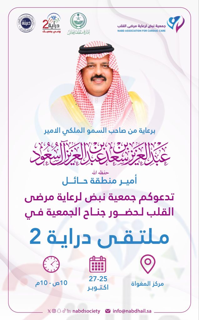 برعاية كريمة من صاحب السموّ الملكي الأمير عبدالعزيز بن سعد بن عبدالعزيز آل سعود، #أمير_منطقة_حائل،انطلقت فعاليات النسخة الثانية من #ملتقى_دراية2 ، الذي تنظّمه جائزة الأميرة صيتة بنت عبدالعزيز للتميّز في العمل الاجتماعي، بمشاركة #جمعية_نبض لدعم مرضى القلب بحائل، تعزيزًا للوعي الصحي وخدمةً للمجتمع