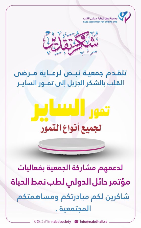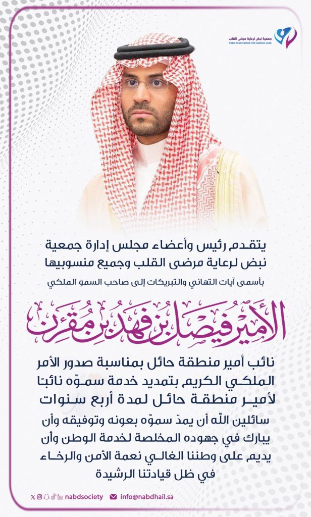 يتقدم رئيس وأعضاء مجلس إدارة جمعية نبض لرعاية مرضى القلب بمنطقة حائل بالتهنئة لصاحب السمو الملكي #الأمير_فيصل_بن_فهد_ال_سعود نائب أمير #منطقة_حائل