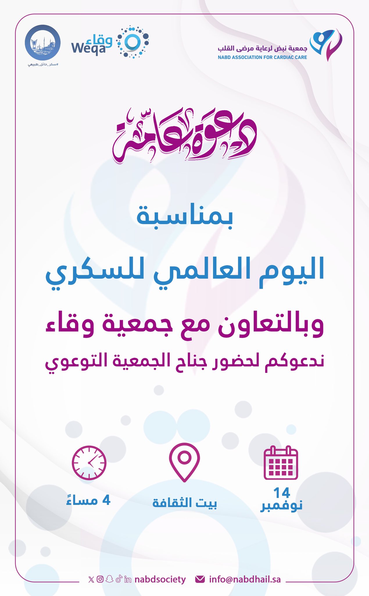 يسر #جمعية_نبض لرعاية مرضى القلب بالتعاون مع #جمعية_وقاء للوقاية من السكري بحائل دعوتكم لحضور الركن التعريفي التوعوي للجمعية وذلك بمناسبة #اليوم_العالمي_للسكري